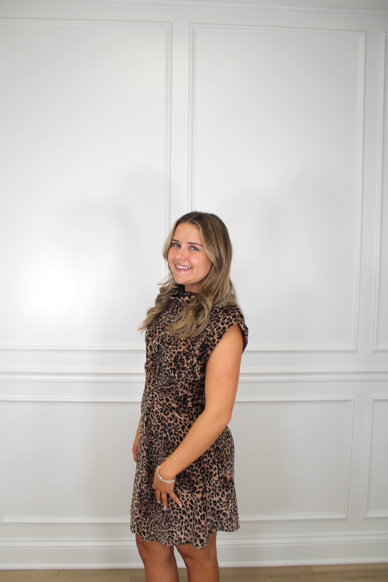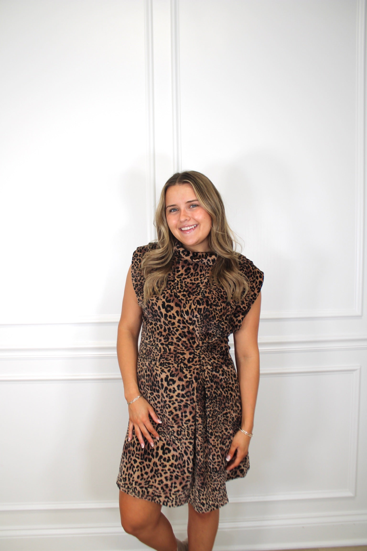 The Harlie Dress is your go-to piece for turning heads with effortless style. This sleeveless mini dress features a chic cowl neckline that drapes beautifully, paired with a luxe suede texture and bold cheetah print that demands attention. Perfect for nights out, brunch dates, or whenever you want to add a wild touch to your wardrobe. Dress it up with heels and statement jewelry, or keep it casual with sneakers for an edgy vibe. This is the dress that makes you feel confident, fierce, and undeniably fabulous.