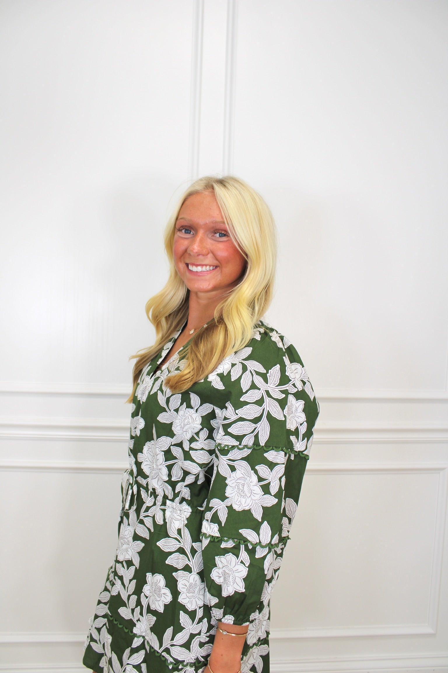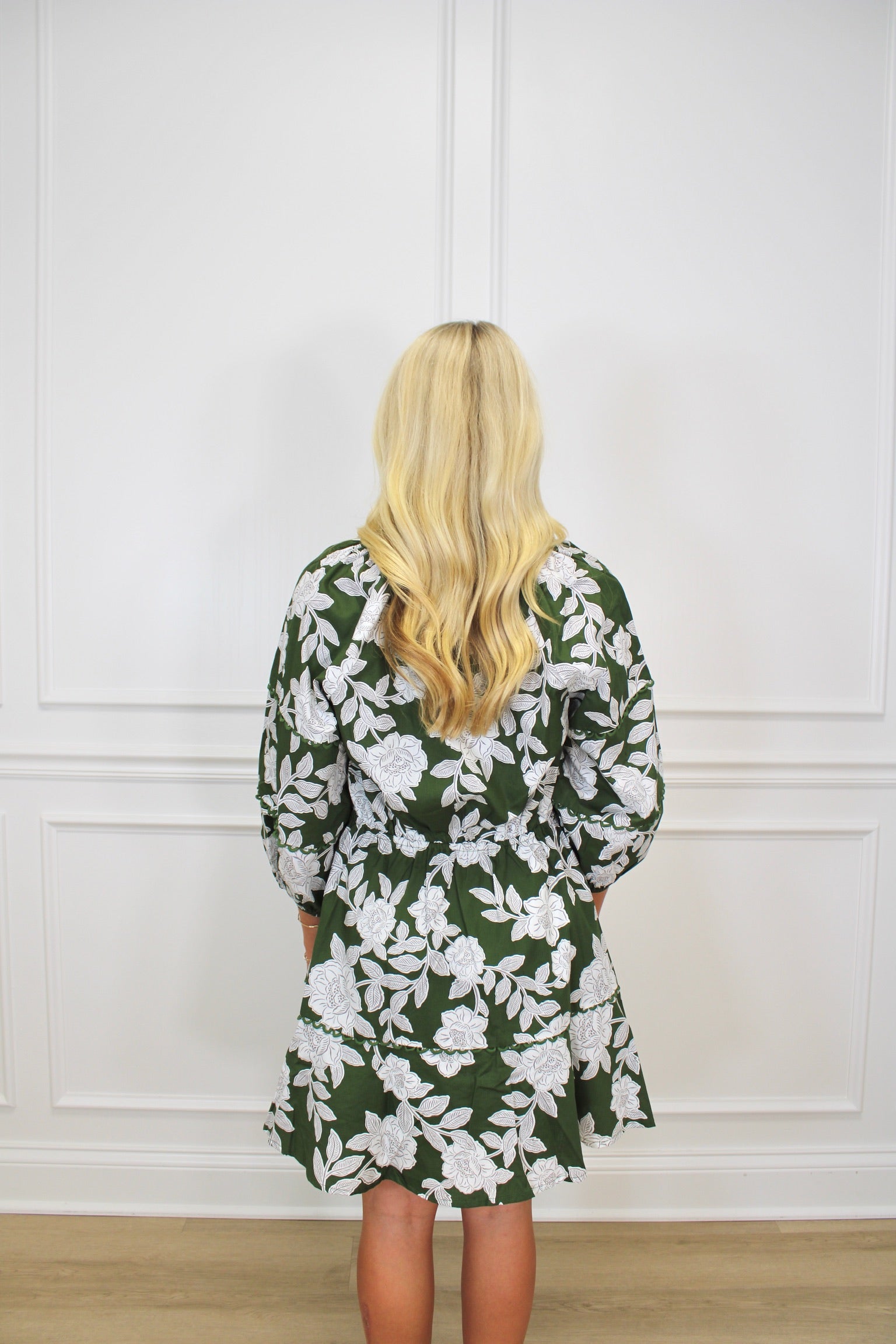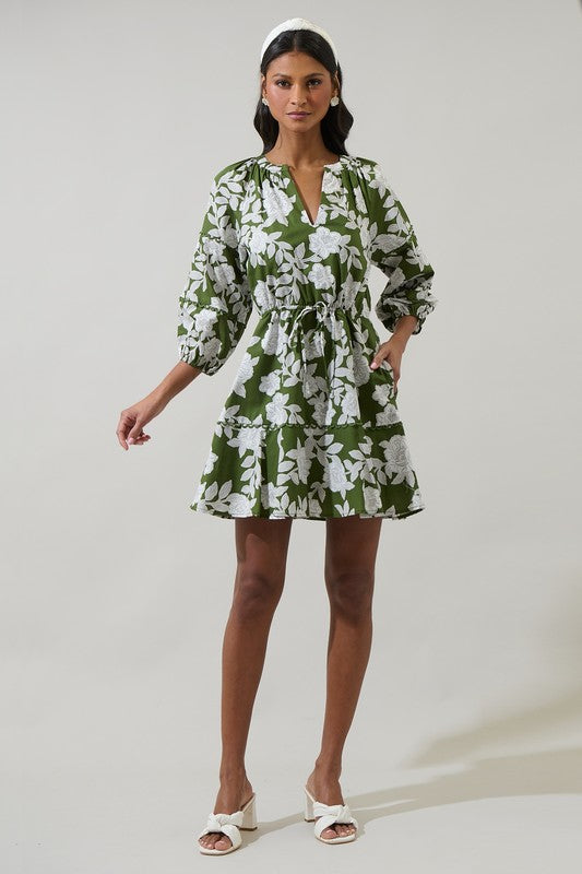 Step into sunshine with the Floral Charm Dress—a playful green mini with a flirty V-neck and long sleeves. The tie waist lets you cinch just right, while delicate scalloped trims add a sweet, whimsical touch. Perfect for twirling into springtime fun or catching eyes wherever you go!