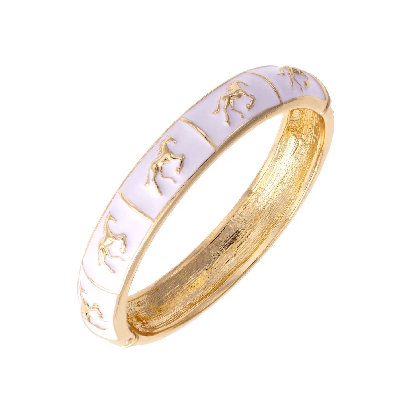 A sculpted hinge bangle featuring enamel horse detailing. Bold, playful, and made to stand out. DETAILS 2.5" Diameter