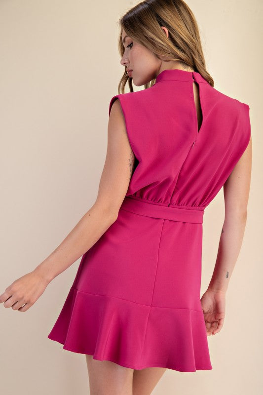 Turn heads in this playful magenta mini dress featuring a chic cowl neck and sleeveless design. Perfect for a wedding guest outfit or easy to dress down for a fun day out, its vibrant color and flattering cut keep your look lively and stylish wherever you go.