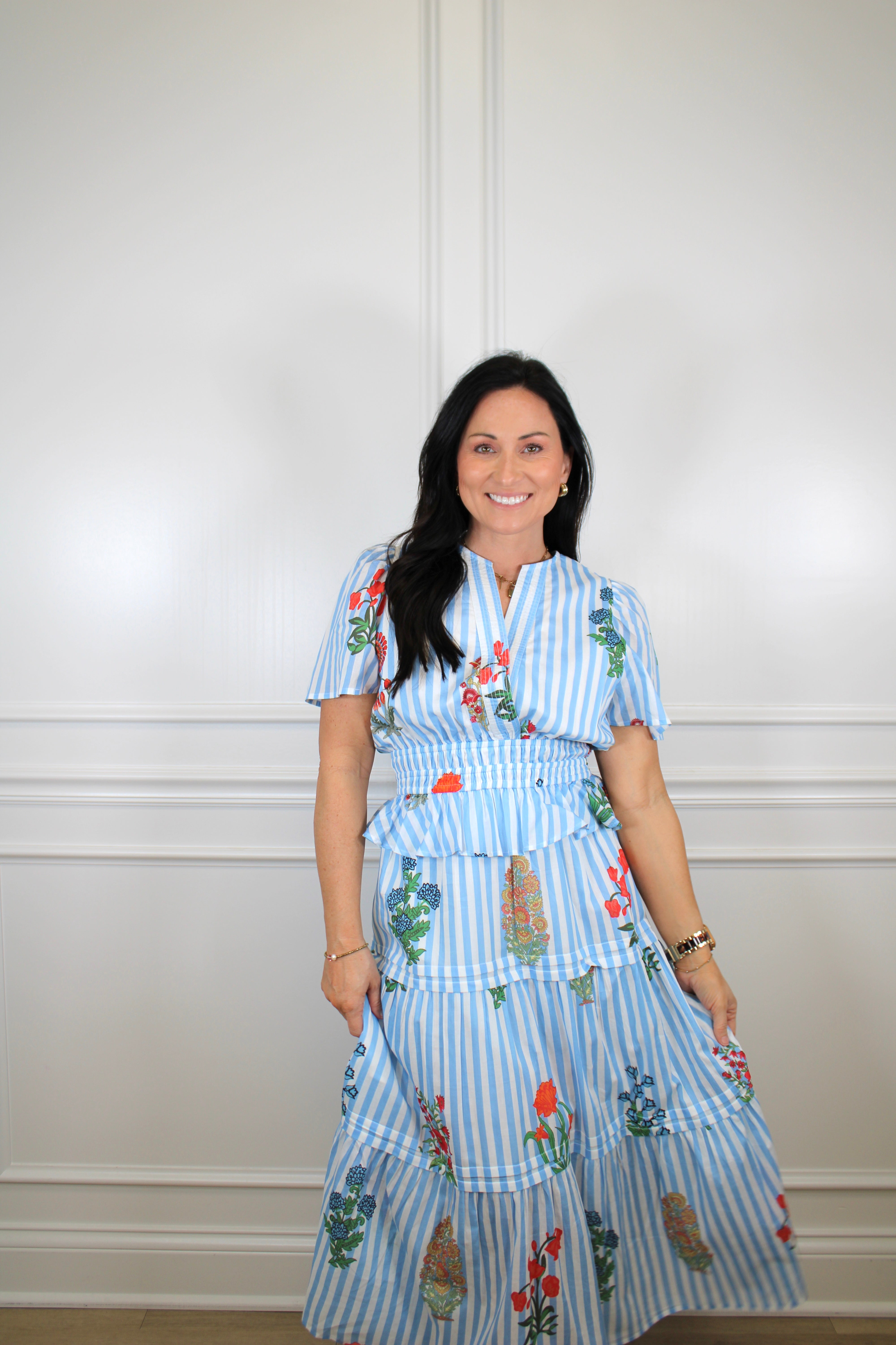 Effortless style meets playful charm in this short sleeve tiered dress. Vertical stripes create a flattering silhouette while delicate floral details add a feminine touch. The layered tiered skirt offers movement and dimension, perfect for warm weather outings. Pair with sandals for casual elegance or dress up with accessories for a polished look.