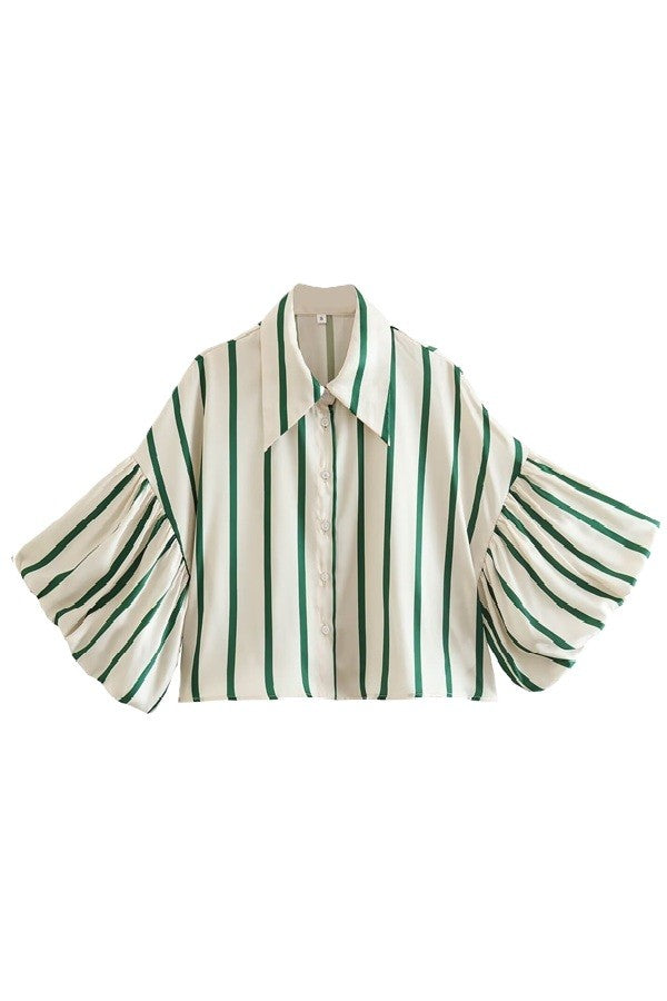 Stripes meet style in this adorable cropped blouse that's perfect for casual days. Featuring a boxy silhouette, front button-down closure, and charming short puff sleeves, it's the effortless piece your wardrobe's been craving. The cropped length hits just right for pairing with high-waisted jeans or skirts. Fun, flirty, and undeniably cute—this striped essential brings personality to any outfit.