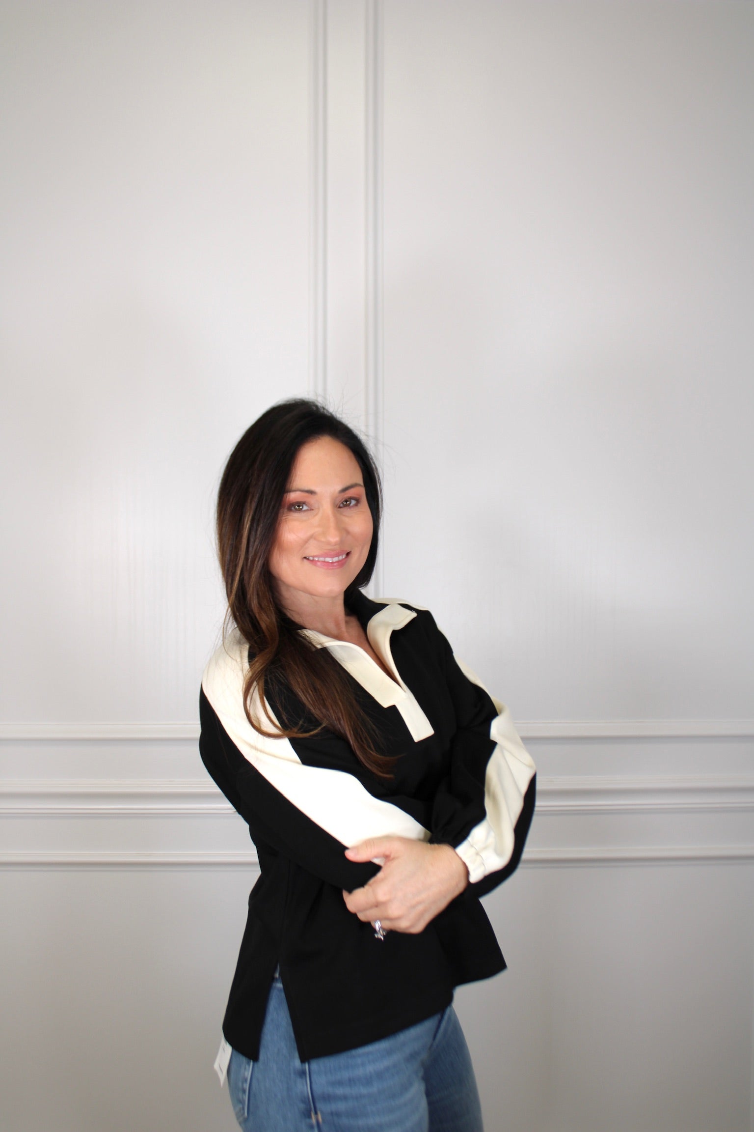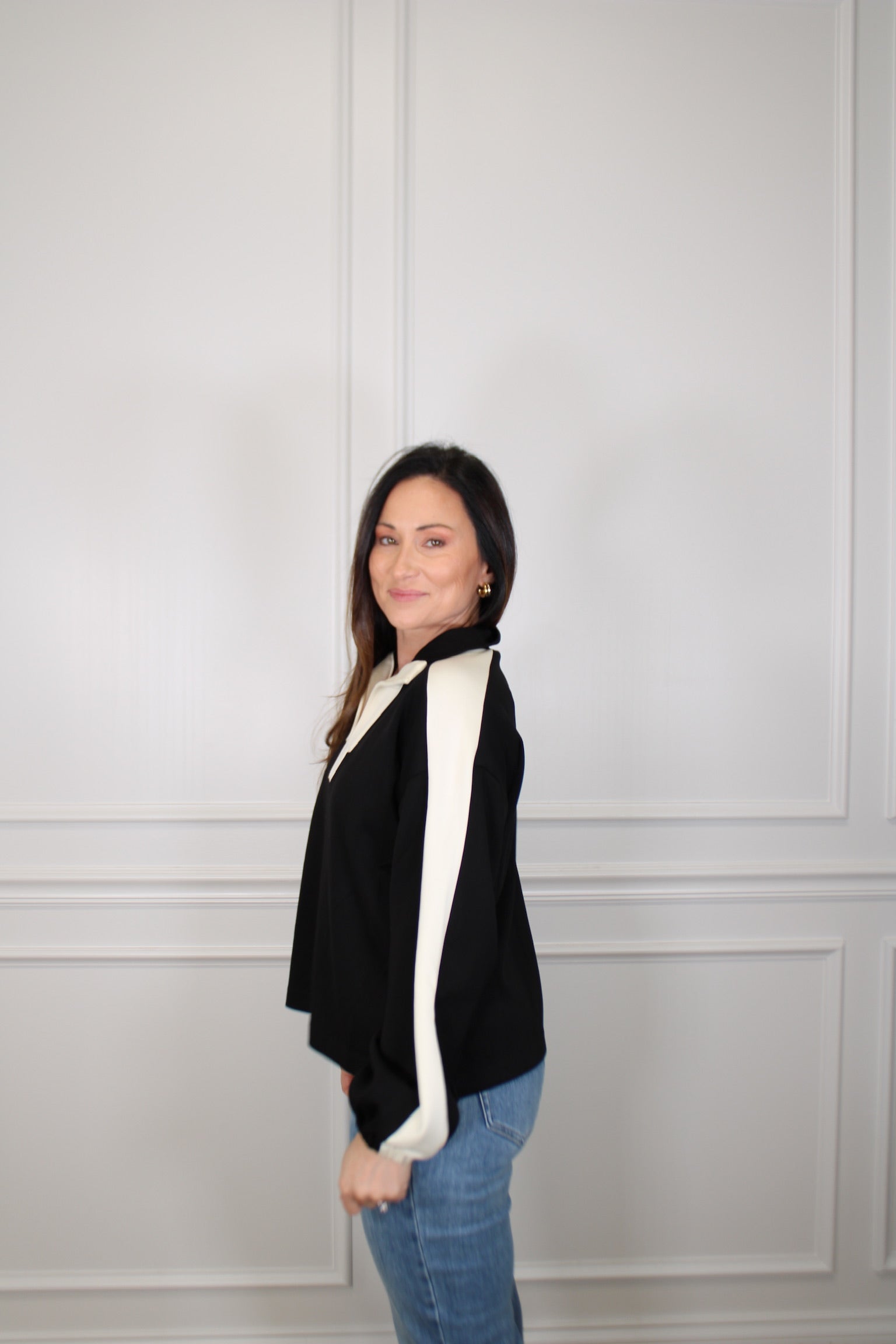 Elevate your everyday wardrobe with this charming long sleeve knit top! Featuring a striking contrast collar and playful stripe detailing along the sleeves, it's designed to turn heads. The elasticated cuffs keep things snug while side slits at the hem add movement and modern flair. Lightweight and non-sheer, this unlined knit piece is perfect for layering or wearing solo. Comfort meets style in one delightfully wearable package.