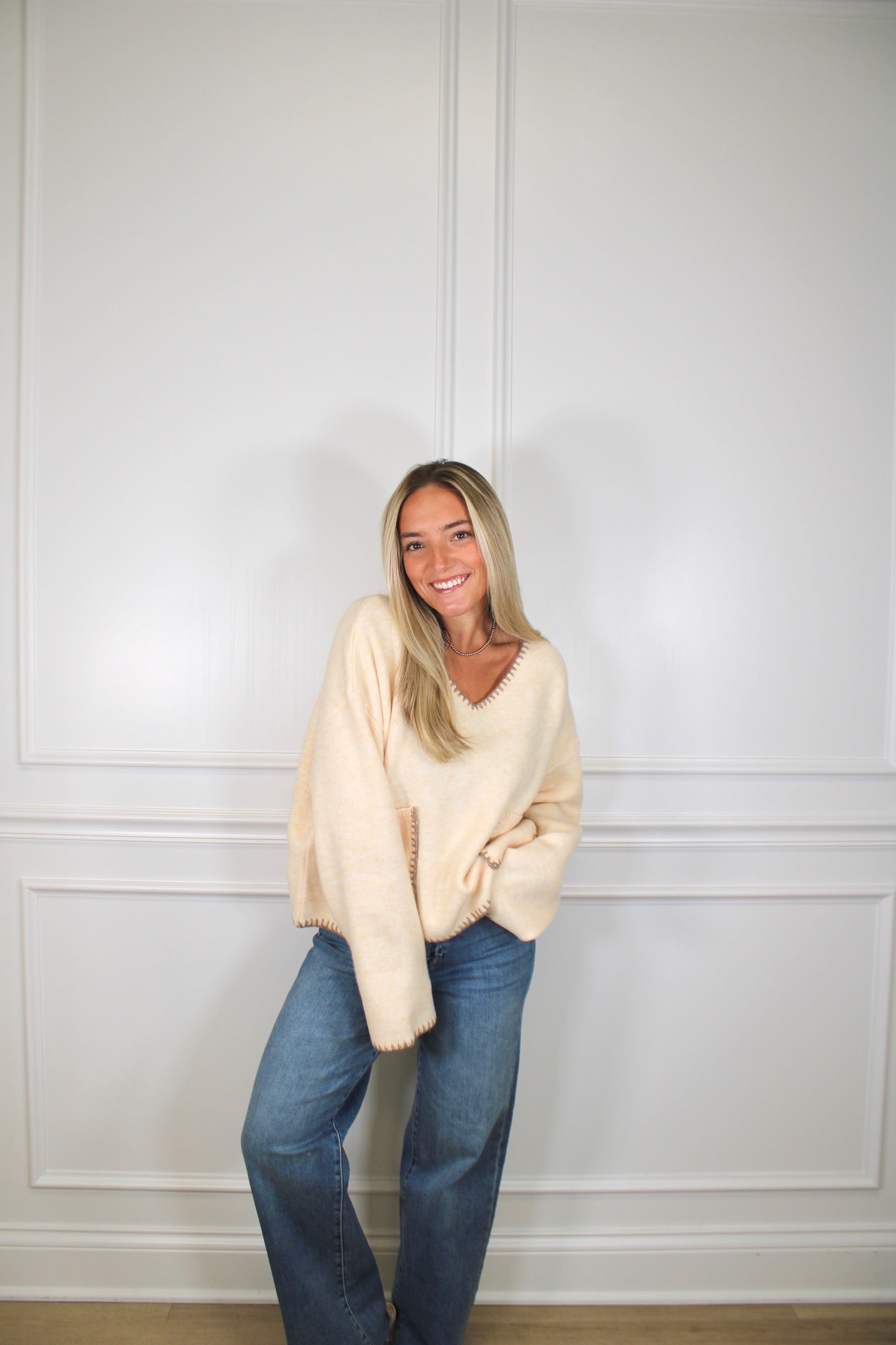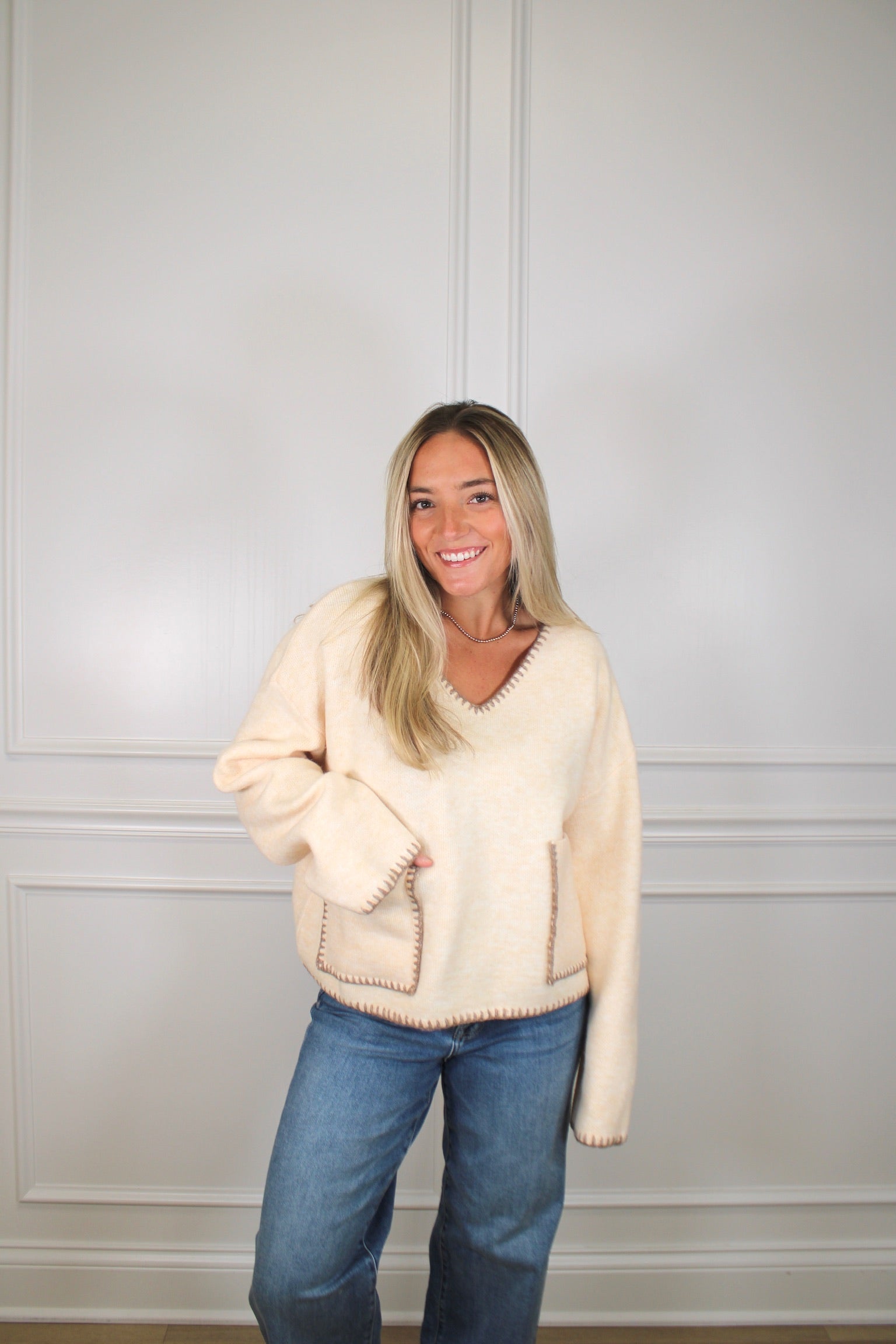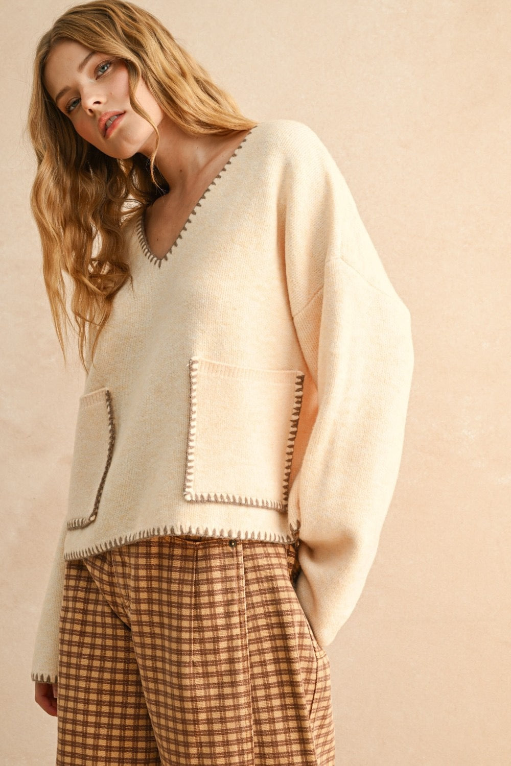 Cozy up in this charming V-neck sweater top featuring adorable stitch detailing that brings a whimsical touch to your everyday wardrobe. The flattering neckline pairs perfectly with jeans, skirts, or layered looks, while the soft fabric keeps you comfortable all day long. Whether you're heading to brunch or settling in for a relaxed weekend, this playful piece adds just the right amount of personality to any outfit. A versatile staple that's sure to become your go-to favorite!