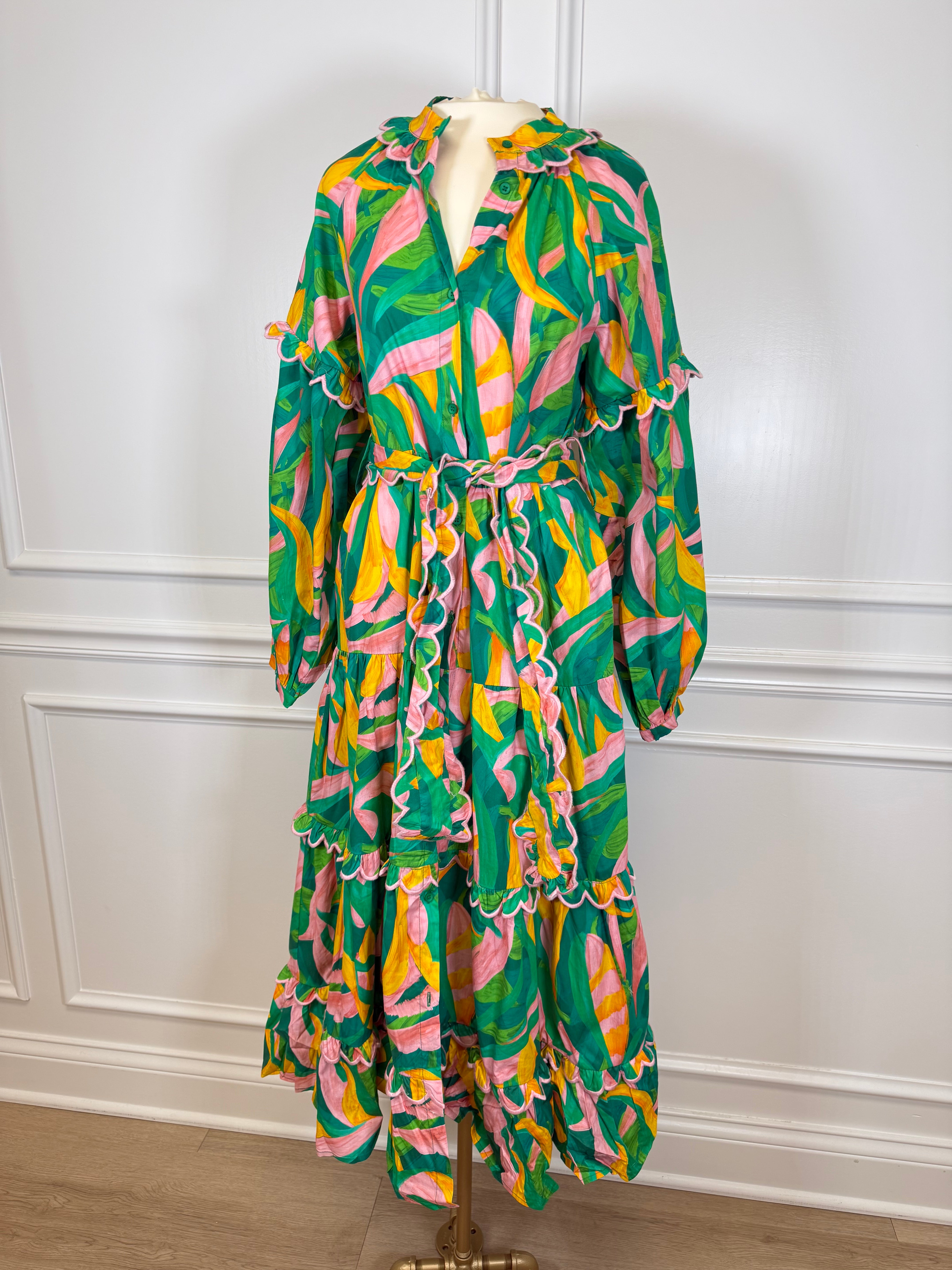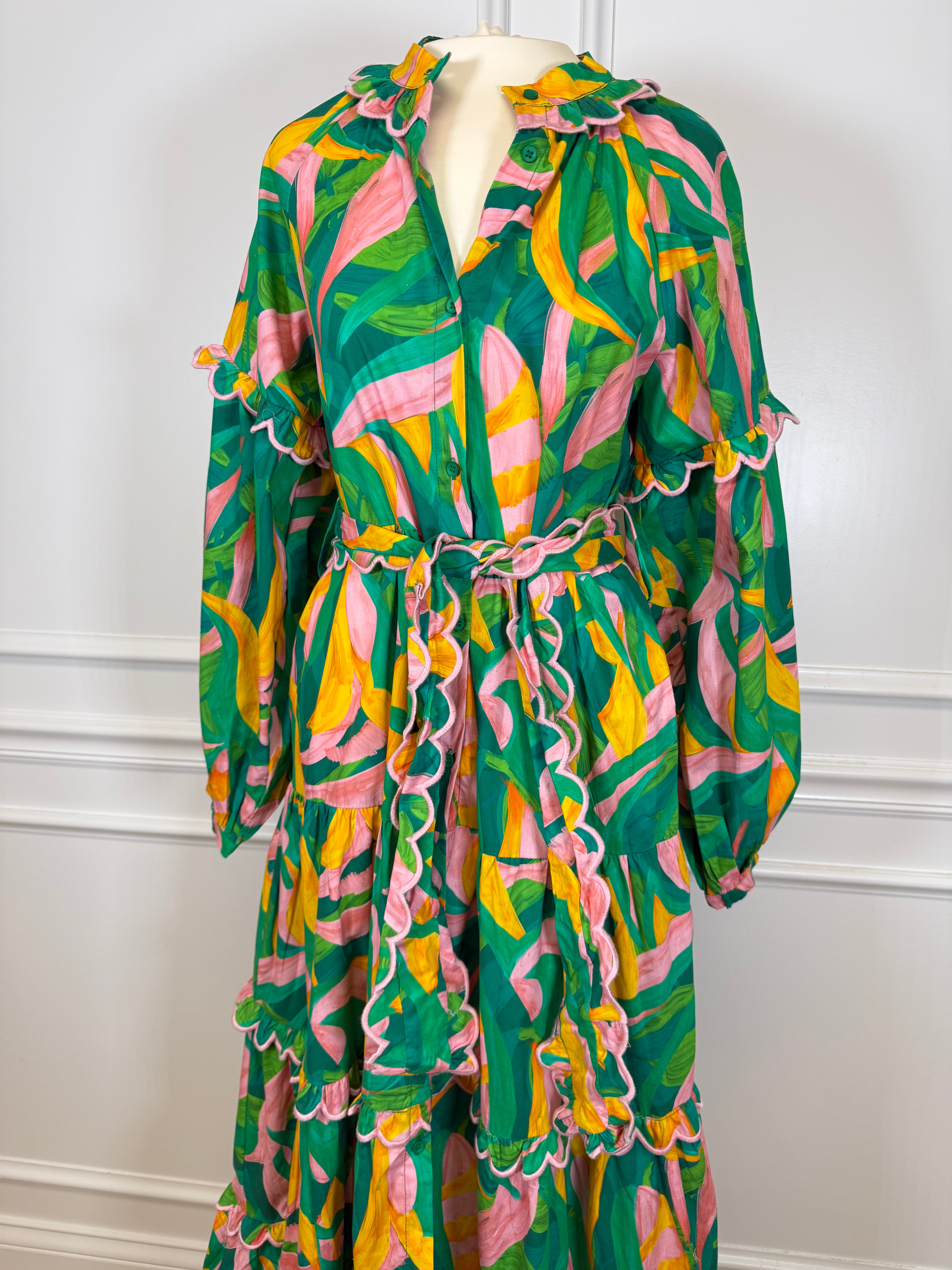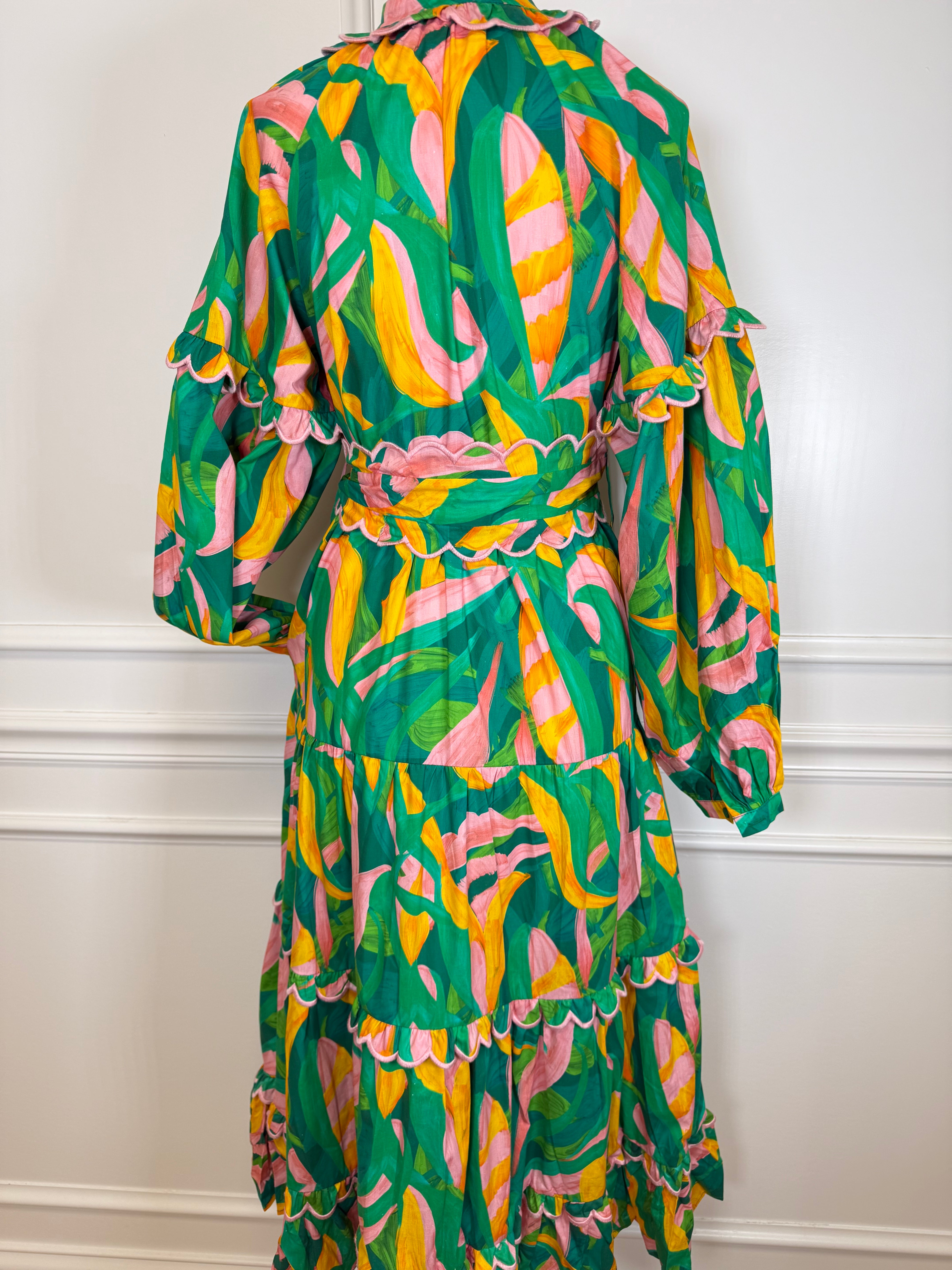 Escape to paradise with The Trana Tropical Dress, a stunning long sleeve maxi silhouette that brings vibrant island energy to your wardrobe. Featuring a bold tropical pattern in rich, eye-catching hues, this dress captures the essence of exotic getaways. The fitted belt cinches at the waist to create a flattering, defined silhouette while the flowing maxi length offers elegant movement and comfort. Perfect for resort wear, vacation days, or whenever you want to infuse your look with tropical flair and timeless style.
