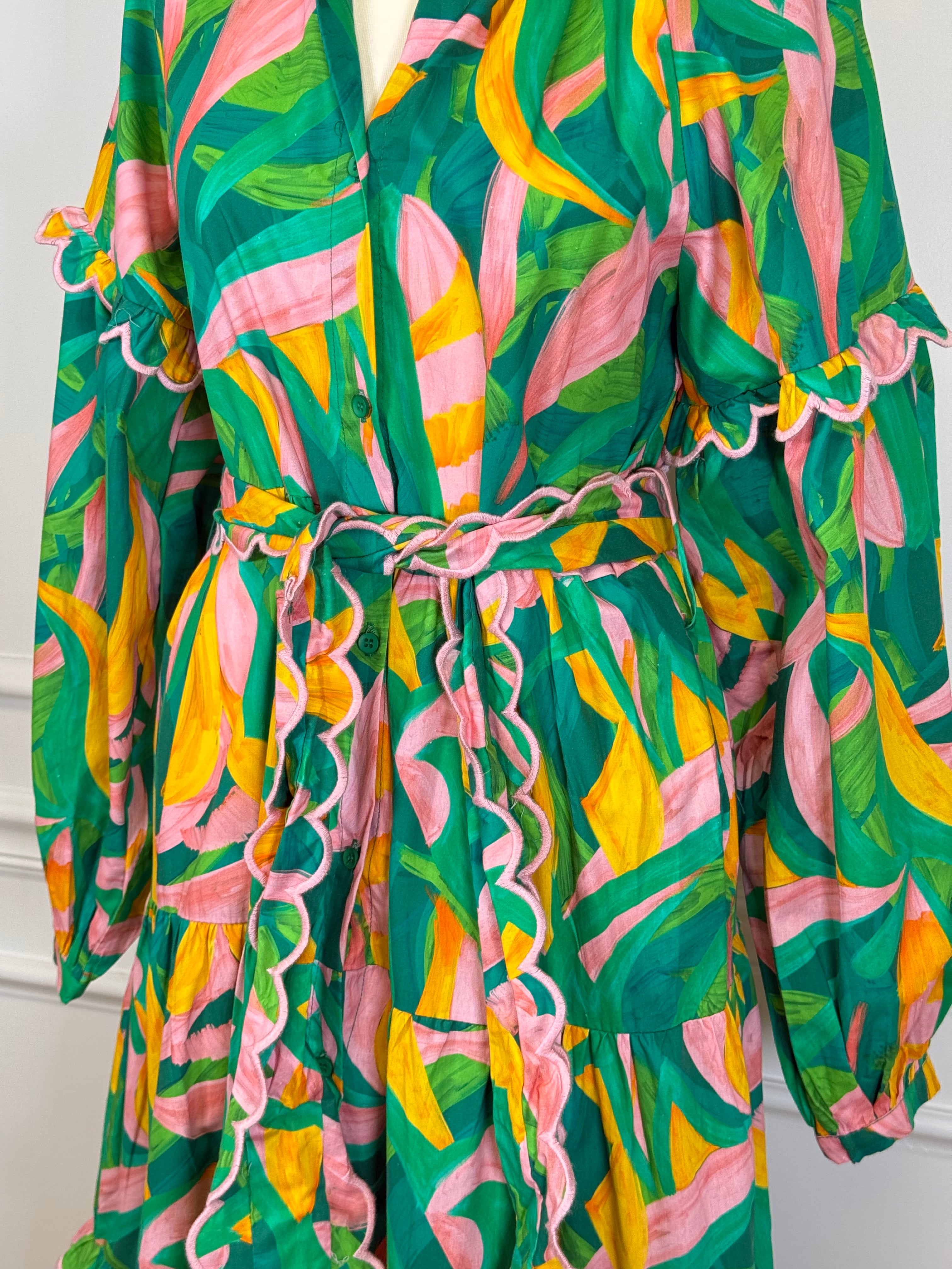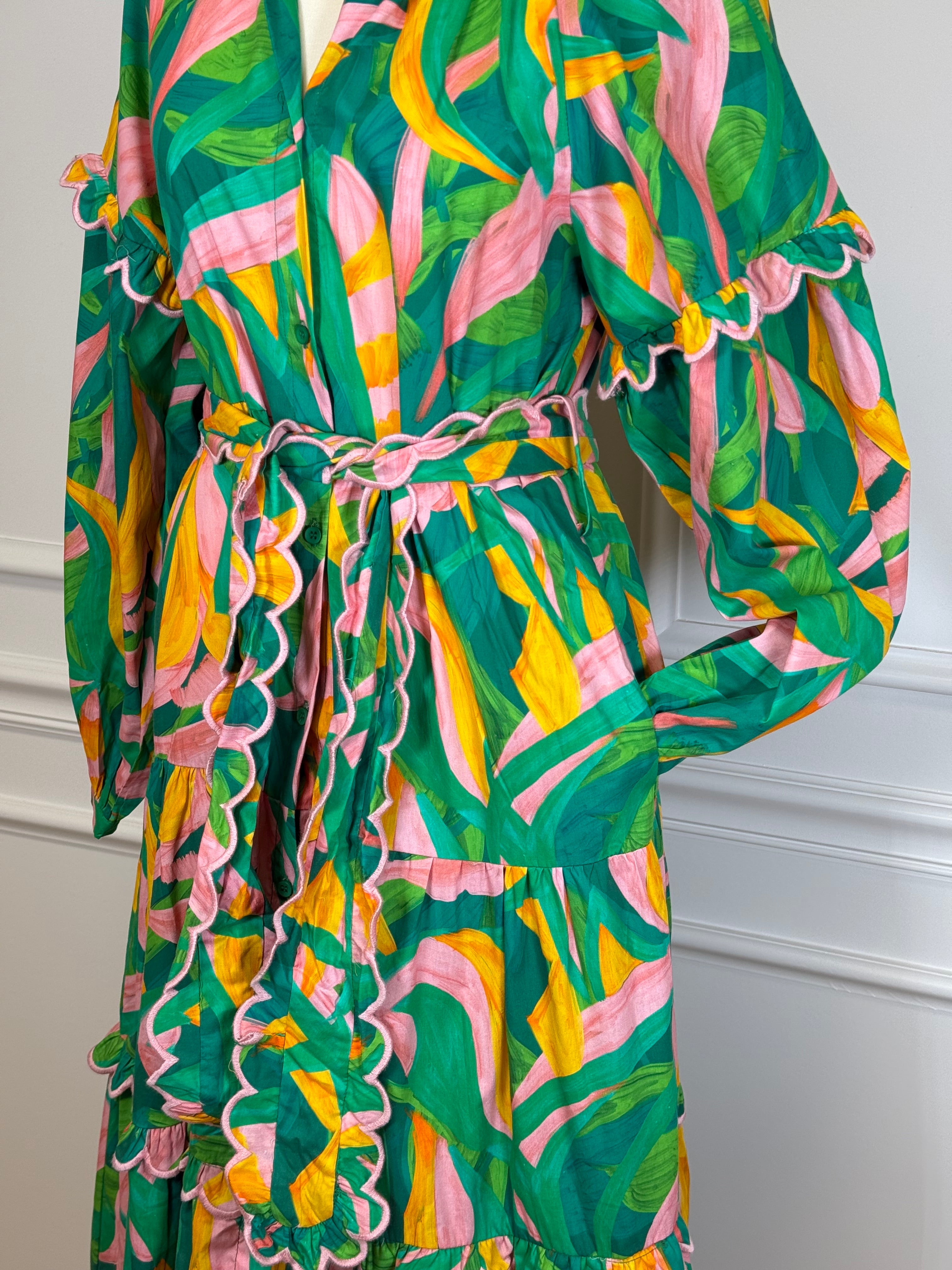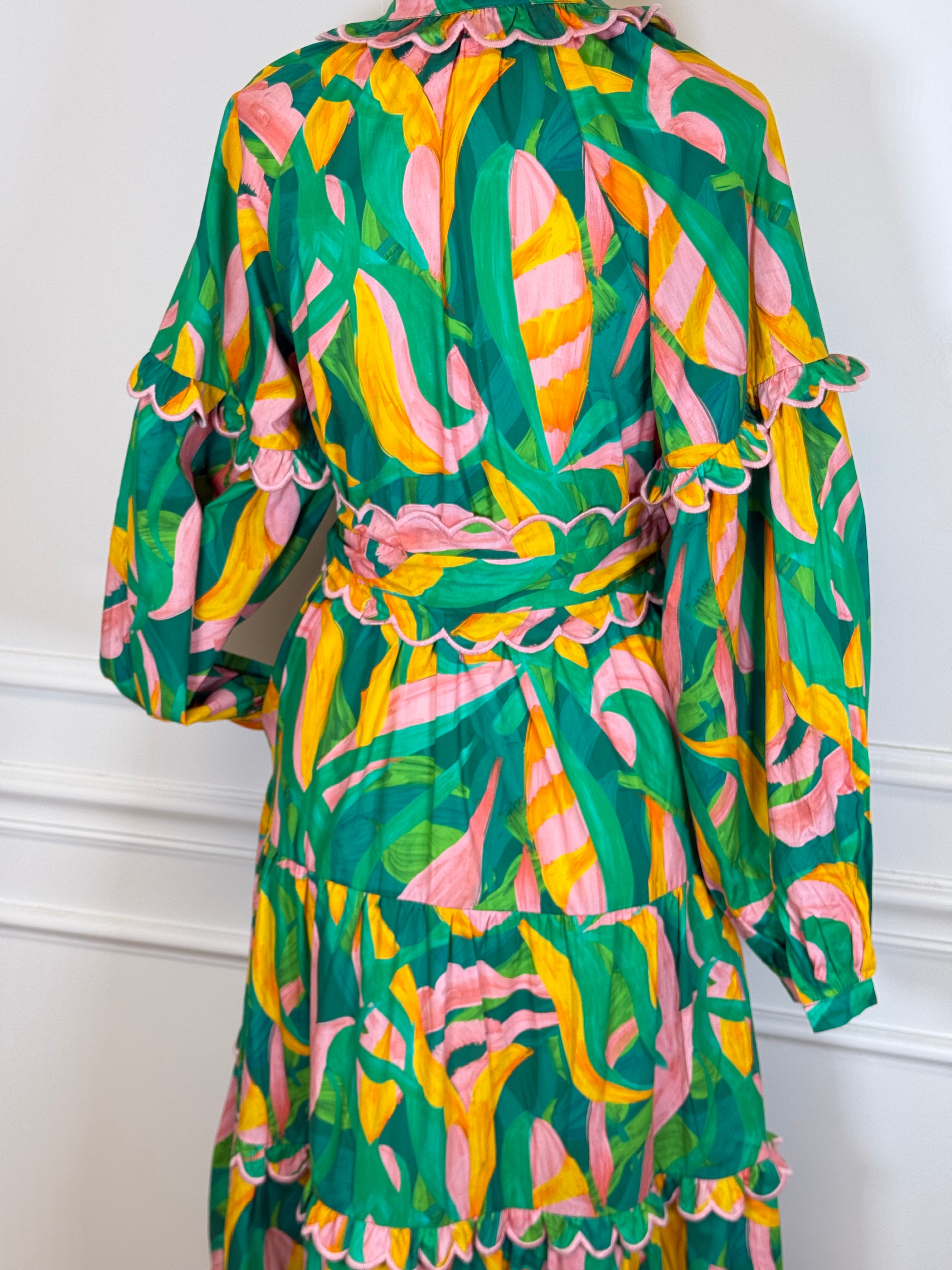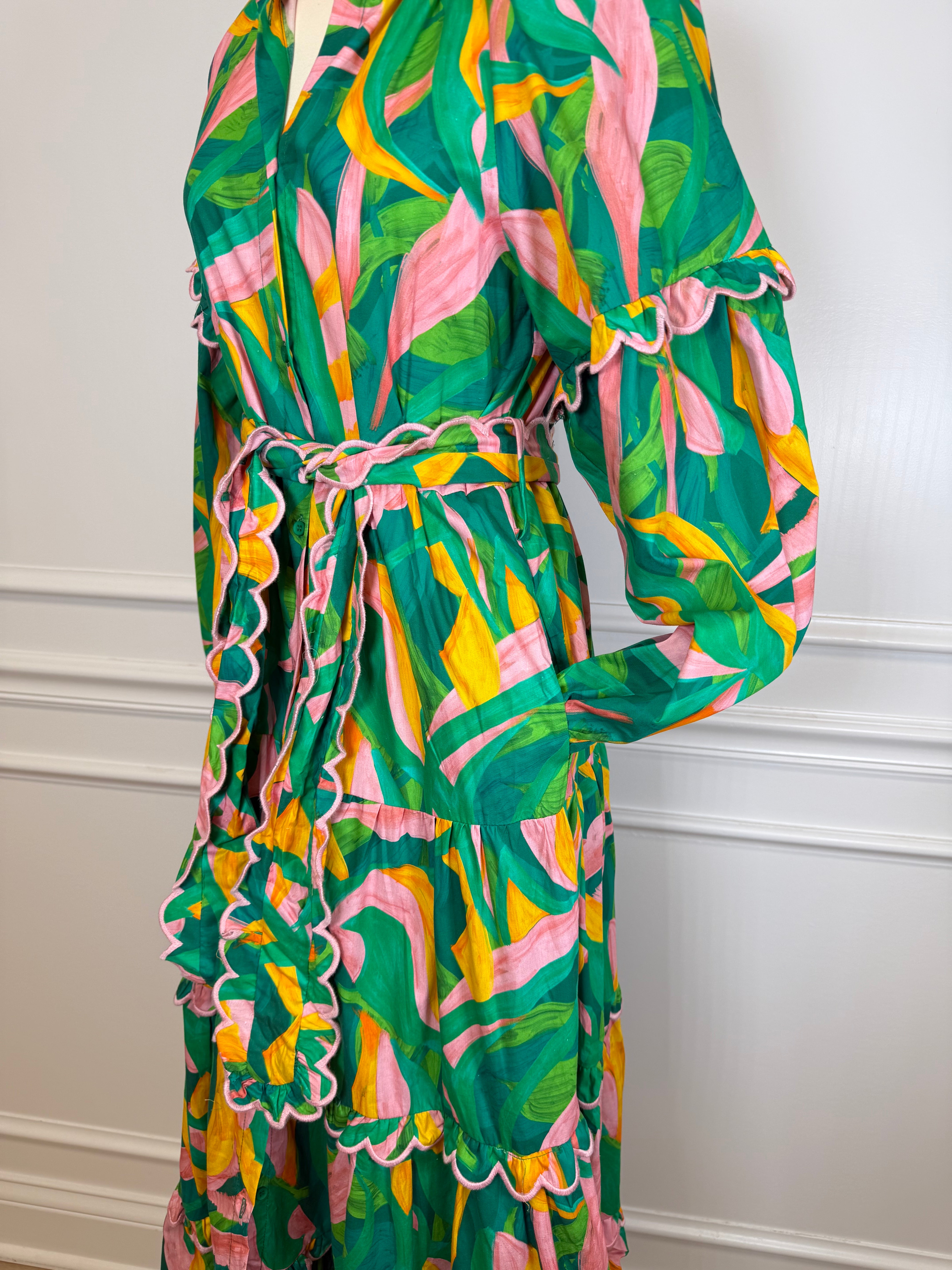 Escape to paradise with The Trana Tropical Dress, a stunning long sleeve maxi silhouette that brings vibrant island energy to your wardrobe. Featuring a bold tropical pattern in rich, eye-catching hues, this dress captures the essence of exotic getaways. The fitted belt cinches at the waist to create a flattering, defined silhouette while the flowing maxi length offers elegant movement and comfort. Perfect for resort wear, vacation days, or whenever you want to infuse your look with tropical flair and timeless style.