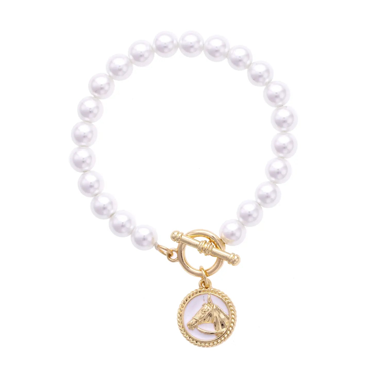 Wrap your wrist in timeless elegance with this stretch toggle bracelet, where creamy ivory pearls dance alongside thoroughbred-inspired accents. The stretchy design means no fussing with clasps—just slip it on and go. Whether you're channeling your inner equestrian or simply love a touch of refined style, this bracelet delivers comfort and sophistication in one gorgeous package.